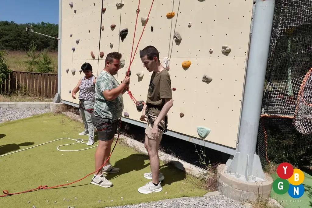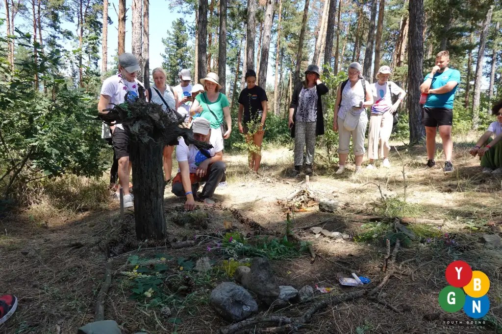 The second day moved to Chavdar Village, famous for the beautiful views and rich history. To build trust and challenge themselves participants began with climbing of the climbing wall high above Chavdar. With ropes and laughter, the group learned to support each other — literally and figuratively — as they climbed together. Then, everyone joined a ‘’Treasure Hunt to Discover Nature Surroundings’’ organized by Trekkify (Italy). It was a chance to explore the surrounding nature and dive into it. Participants relived thousands of years of the village history and all that is hidden below the ground by exploring Topolnitza archeological park. The afternoon was dedicated to immersive sensory activities that invited the group to slow down, observe, and form a deeper bond with nature – ‘’Nature Mosaic’’ by the Lithuanian Sea Museum (Lithuania) and ‘’Tree Therapy’’ by OAZA (Croatia). Collecting objects found in nature to form one mosaic reminded all of us of the inspiration we could receive from nature and how can we easily harm it. Looking up and appreciating the great energy and power of the trees built a close and meaningful relationship with the ecosystem, reminding all of us that it is breathing and helps us breath.